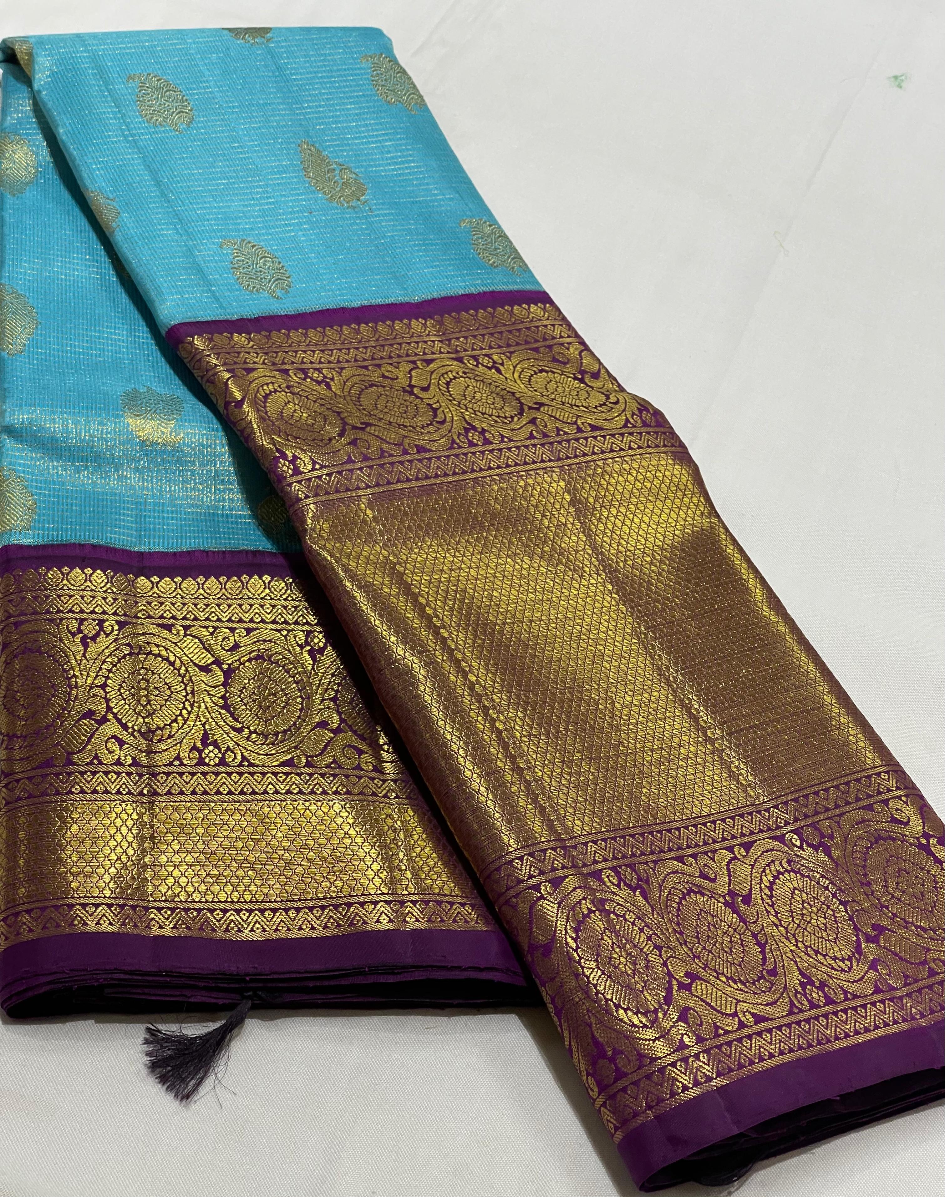 SKY BLUE/PURPLE BORDER COMBITION PURE KANCHI SILK SAREE