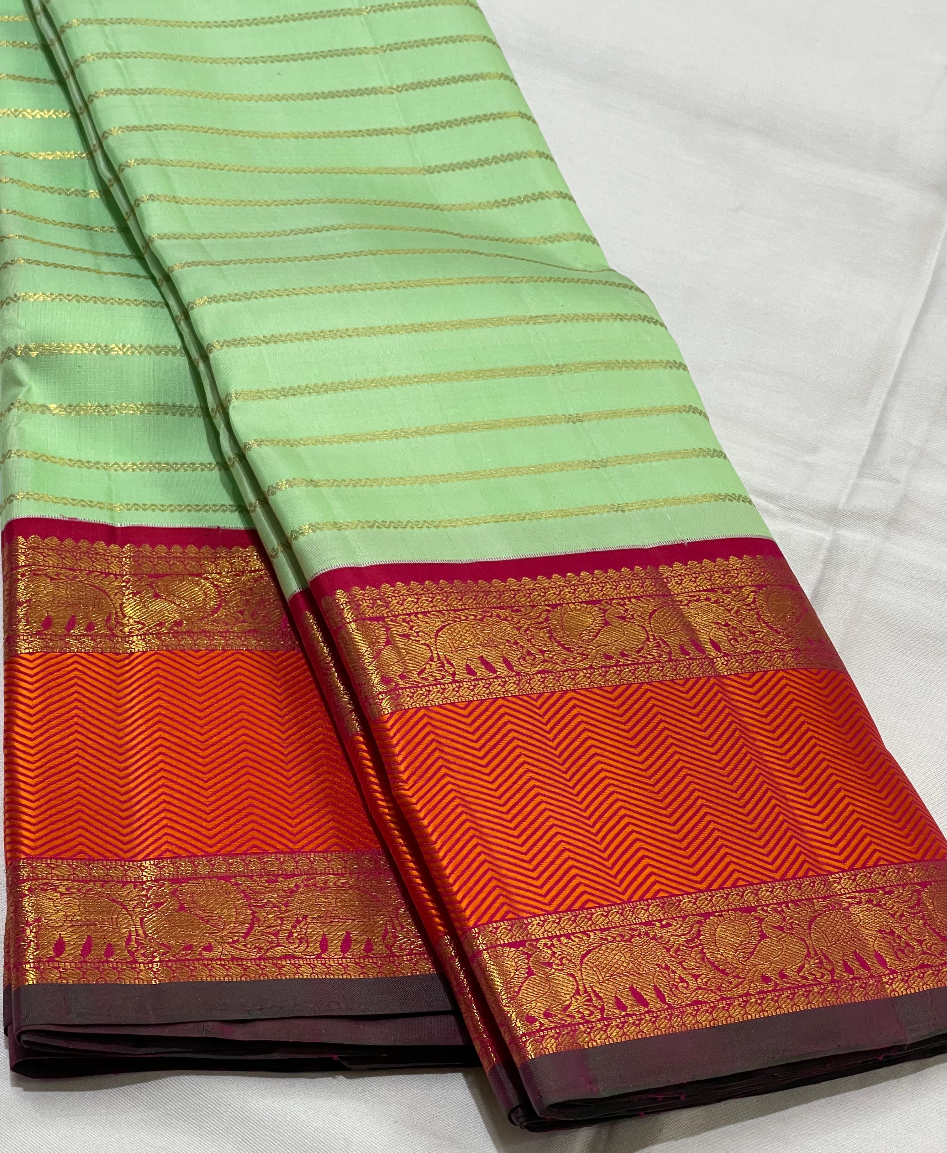 PISTA GREEN/ORANGISH RED BORDER COMBITION PURE KANCHI SILK SAREE
