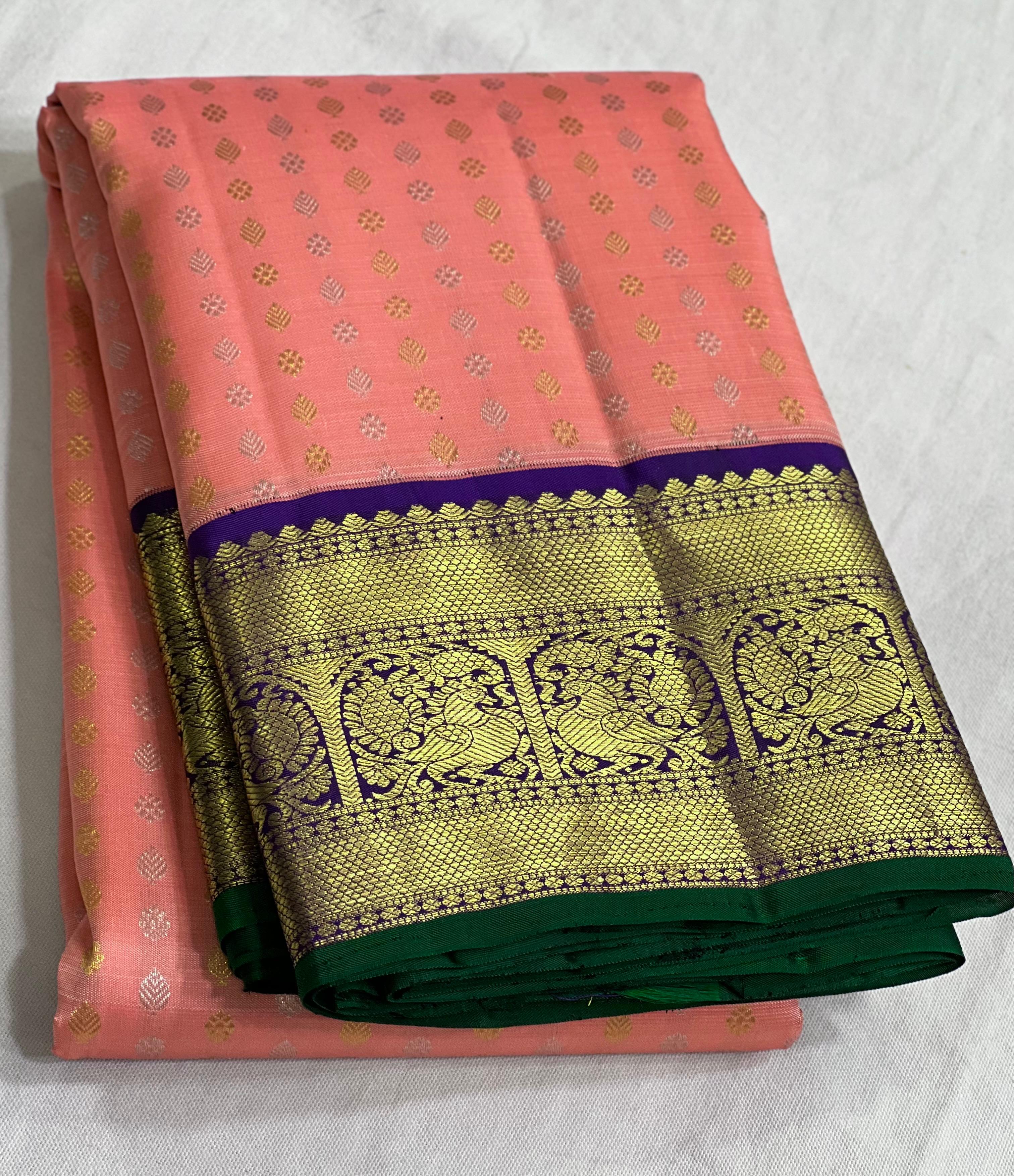 PEACH/VOILET COLOUR ZARI BORDER COMBITION PURE KANCHI SILK SAREE