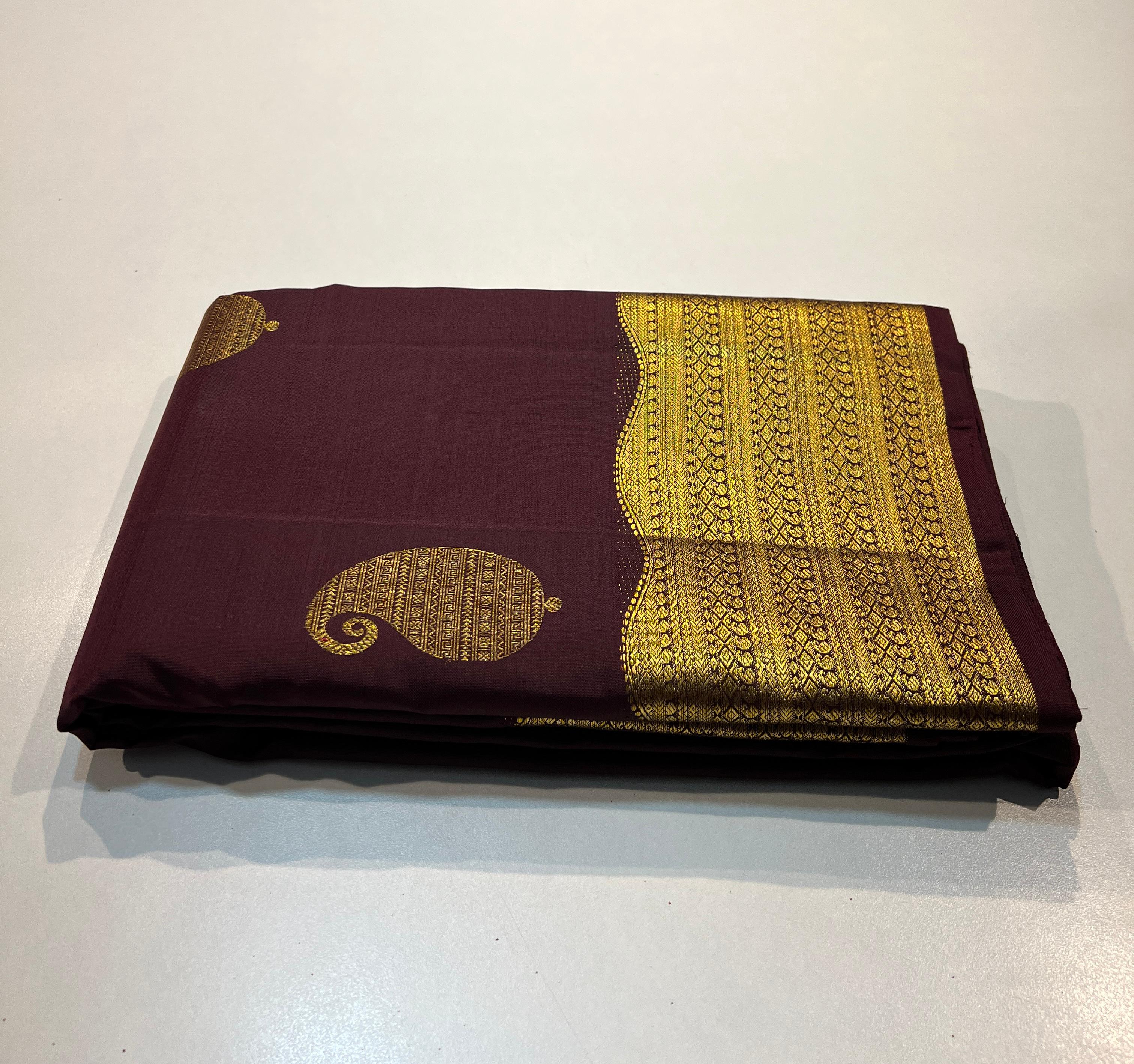 1 gram pure zari,Kanchipuram Handloom silk saree in gold zari,Brown colour combination,Buttis on body,Grand Pallu,Plain blouse.