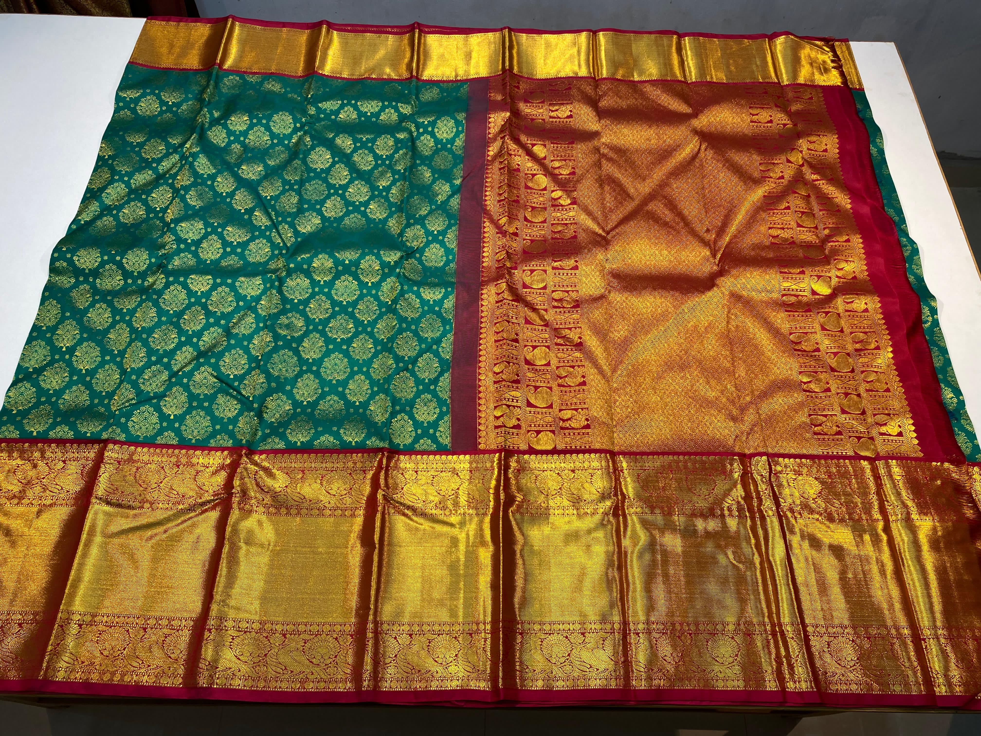 1 gram pure zari,Kanjivaram Handloom Korvai silk Saree,Green with Red color combination,Full brocade floral design on body,Traditional...
