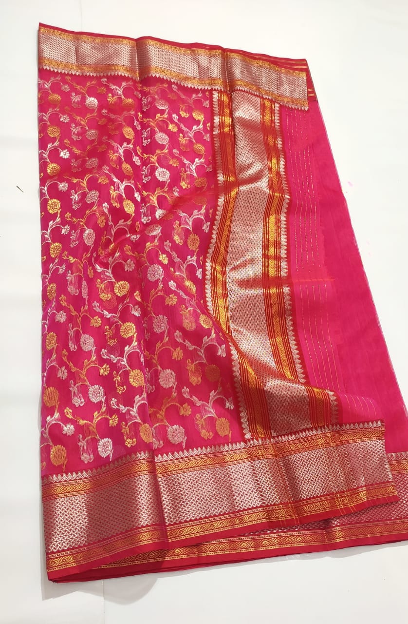 CHANDERI SILK, ZARI BOARDER SREE WITH FLORAL PALLU..