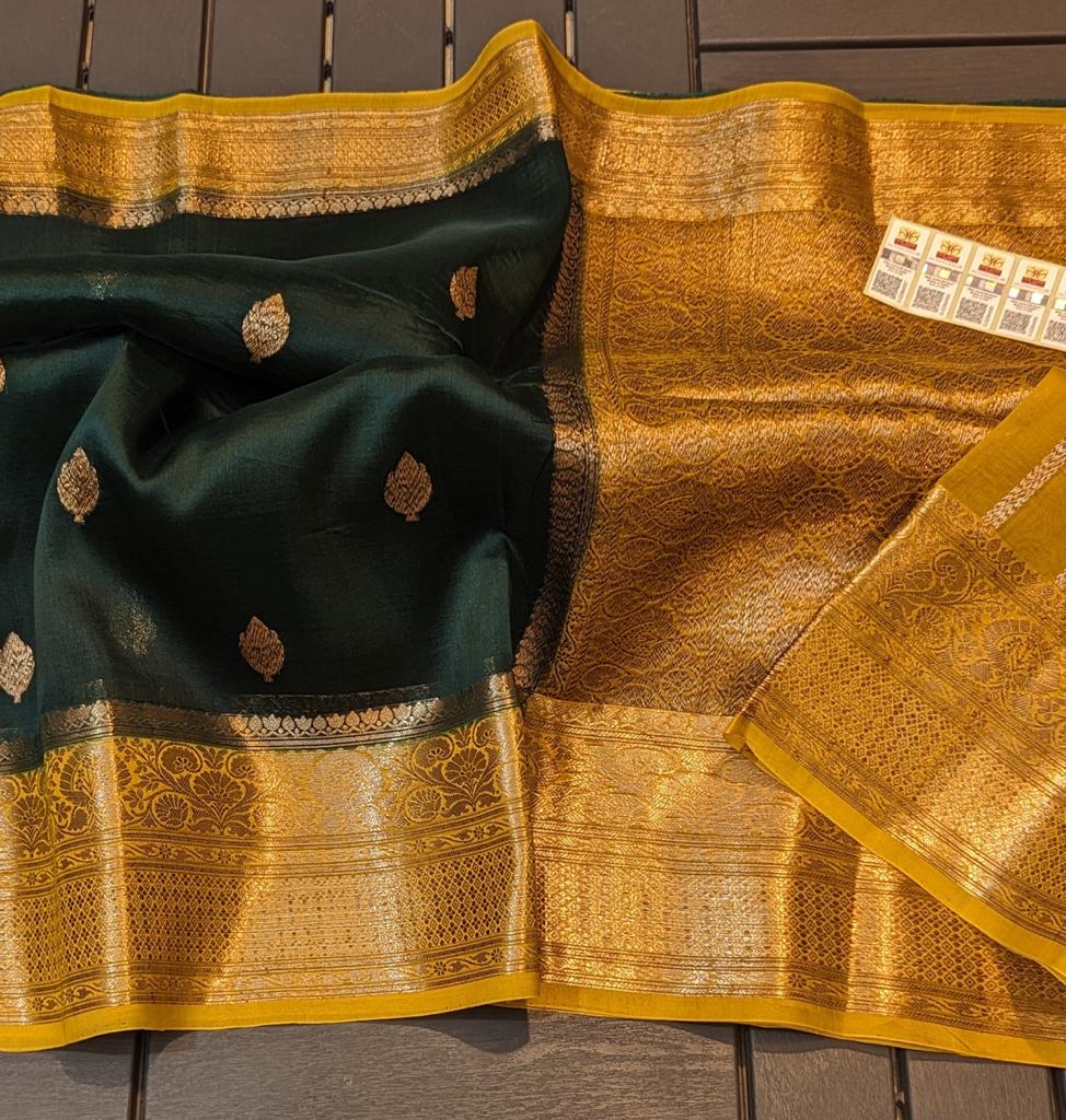 BOTTLE GREEN / YELLOW KORA ORGANZA SILK