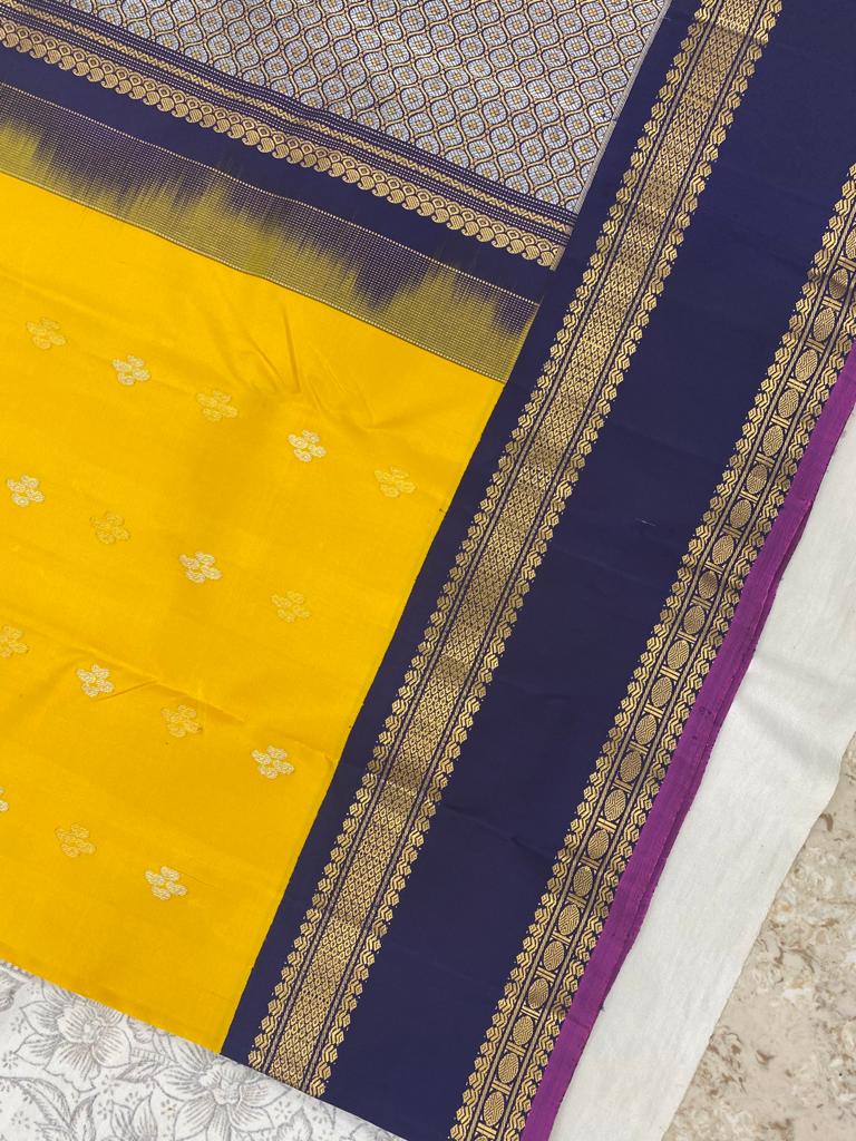 Yellow / Navy Blue Gadwal Pattu saree with a gold border (edge) woven with gold metallic thread, zari. The gold border adds an elegant and festive touch to the saree, making it a popular choice for special occasions and celebrations.