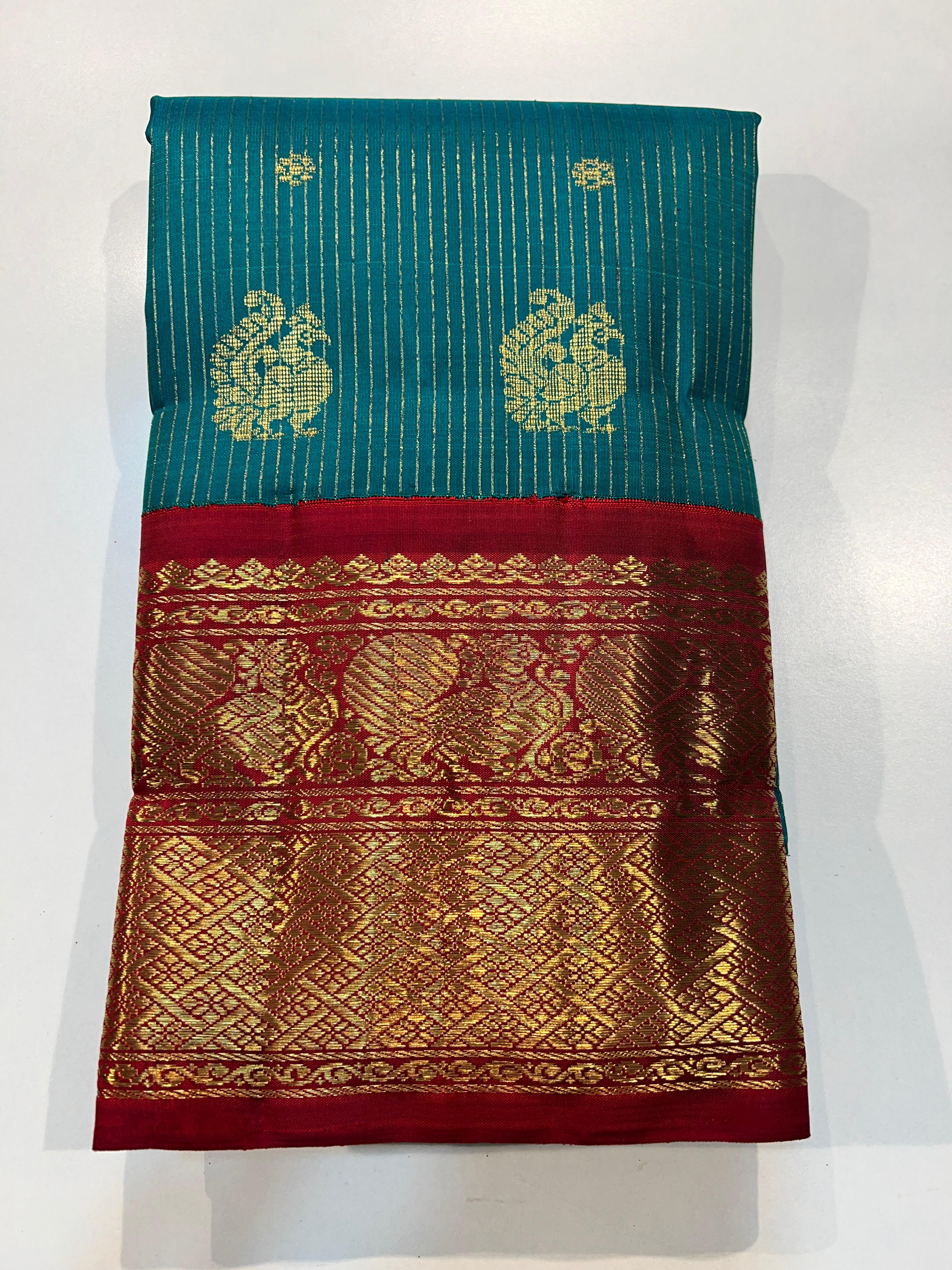 4 gram pure zari,Kanchipuram Handloom one side Border Korvai silk saree,Ramar Green and Arakku red colour,Vaira oosi...