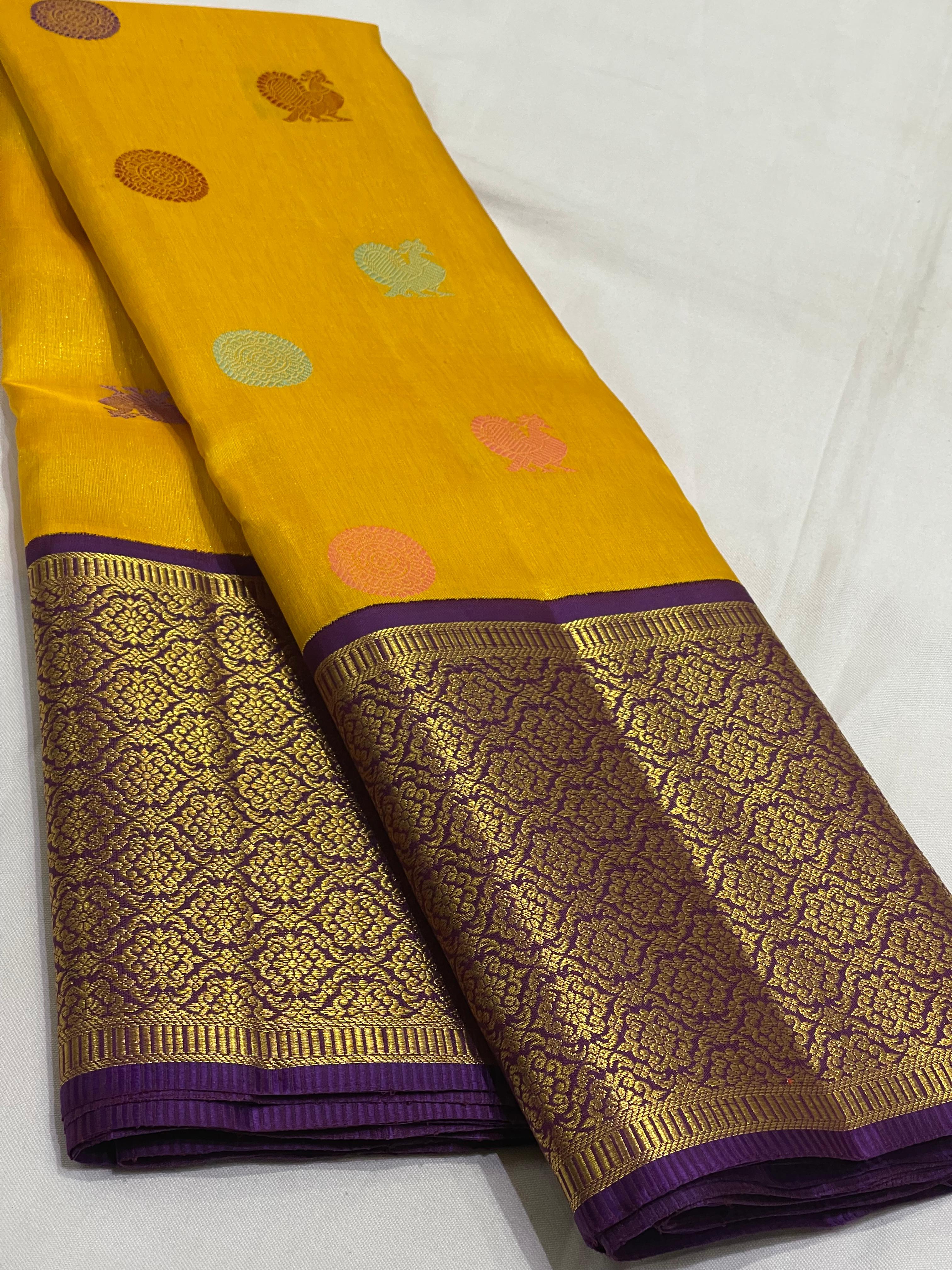 YELLOW /PURPLE COLOUR ZARI BORDER COMBITION PURE KANCHI SILK SAREE