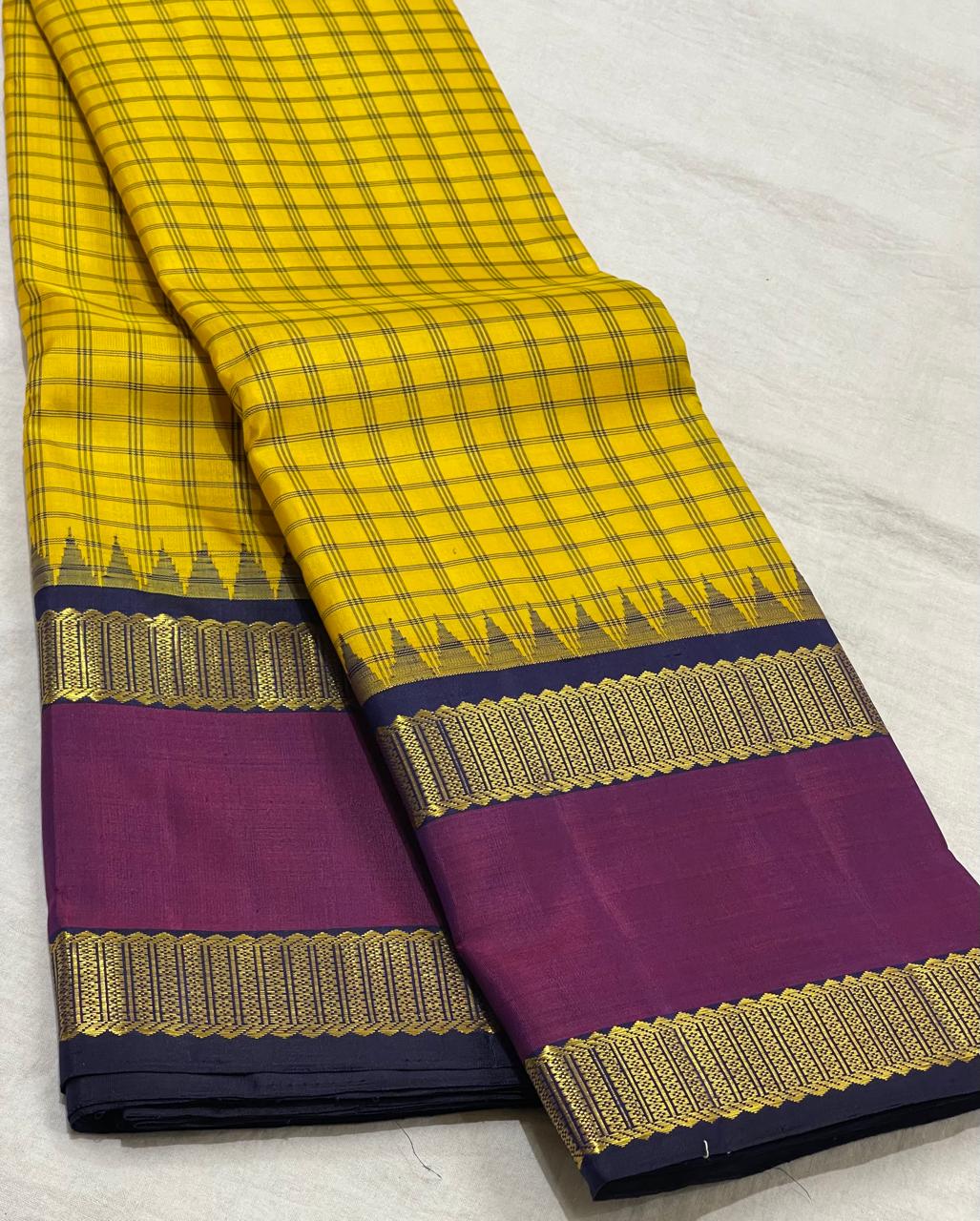 YELLOW/PURPLE/NAVY BLUE BORDER COLOUR COMBITION PURE KANCHI SILK SAREE