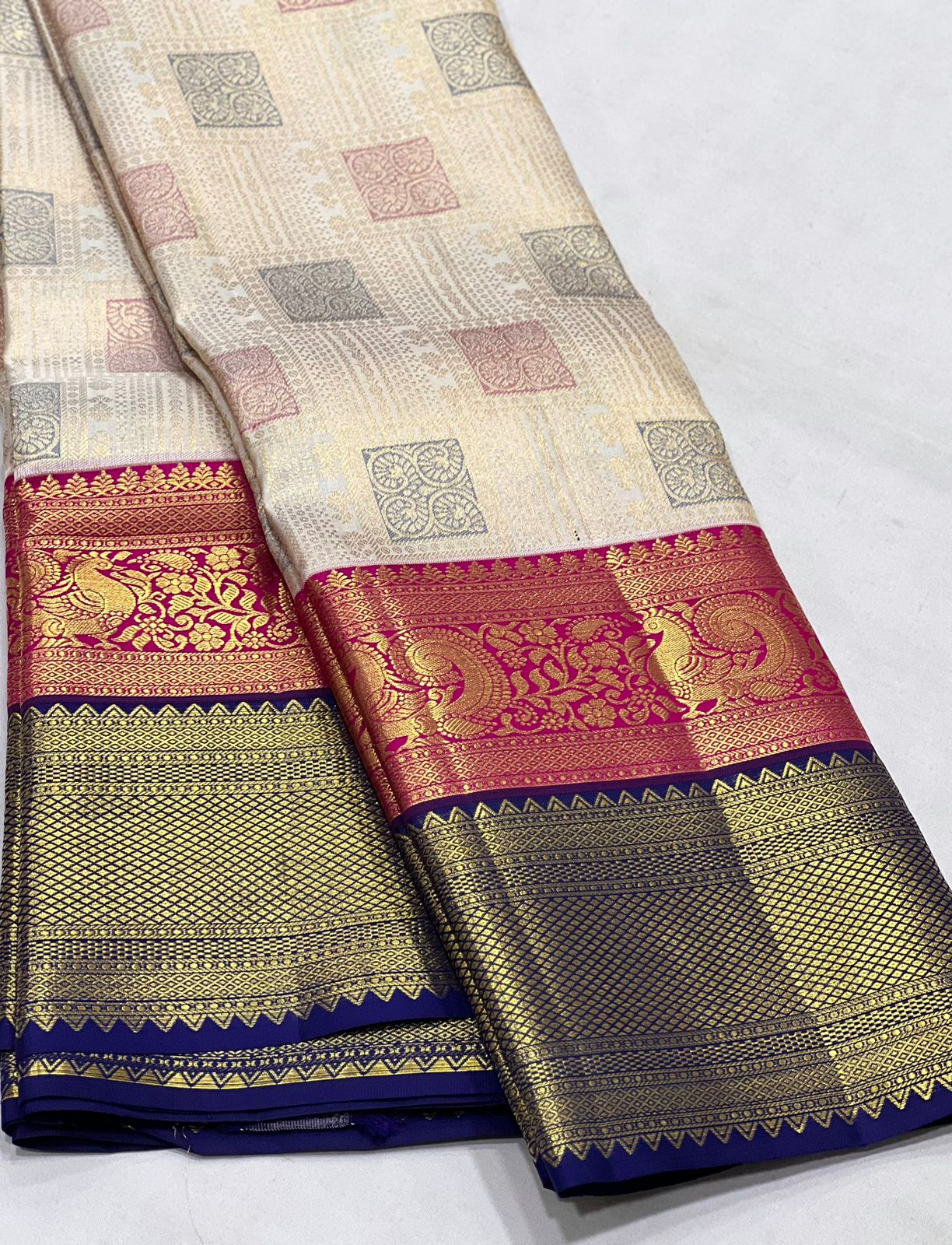 HALF WHITE/MAGENTA PINK/NAVY BLUE WITH ZARI KANCHI SILK SAREE