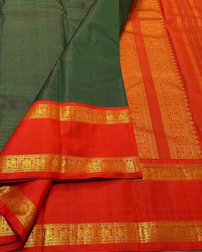 pure zari,Kanchipuram Handloom silk saree in gold zari,Brown colour combination,Buttis on body,Grand Pallu,Plain blouse.