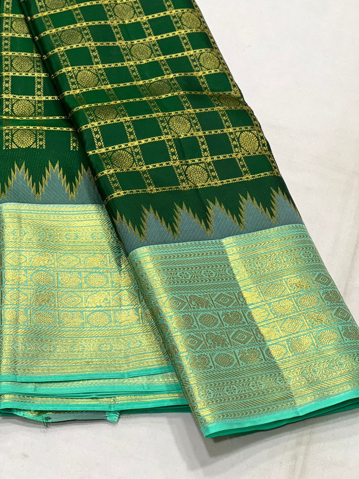 BOTTLE GREEN/LITE TORQUISE GREEN COLOUR COMBITION PURE KANCHI SILK SAREE