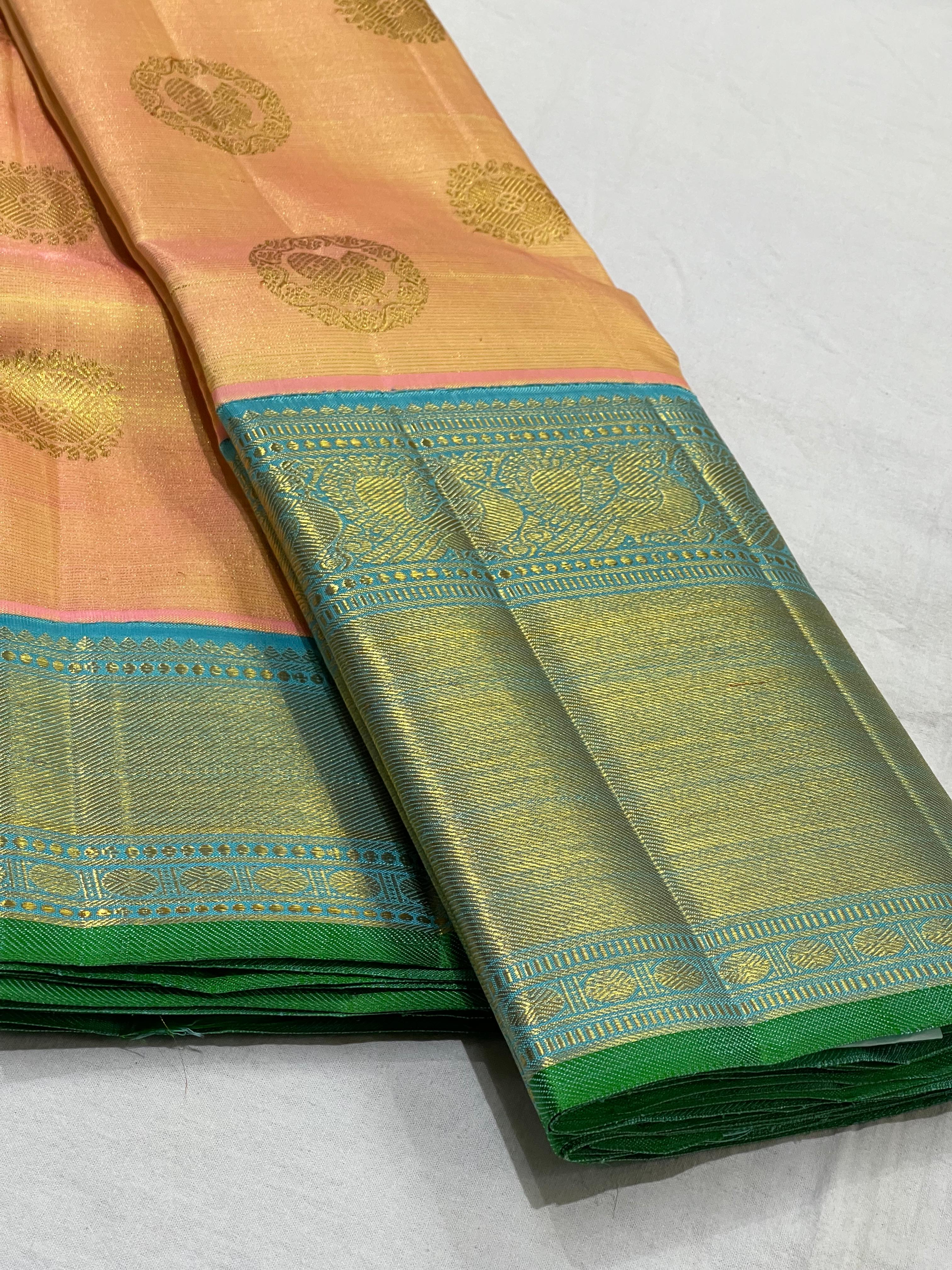 PEACH/SKY BLUE BORDER COMBITION PURE KANCHI SILK SAREE