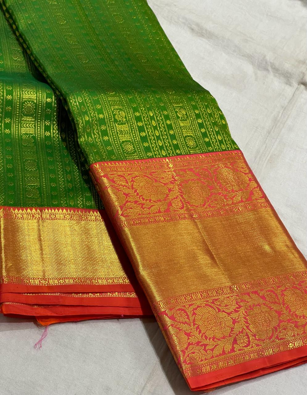 PARROT GREEN/LITE ORANGE COLOUR ZARI BORDER COMBITION PURE KANCHI SILK SAREE