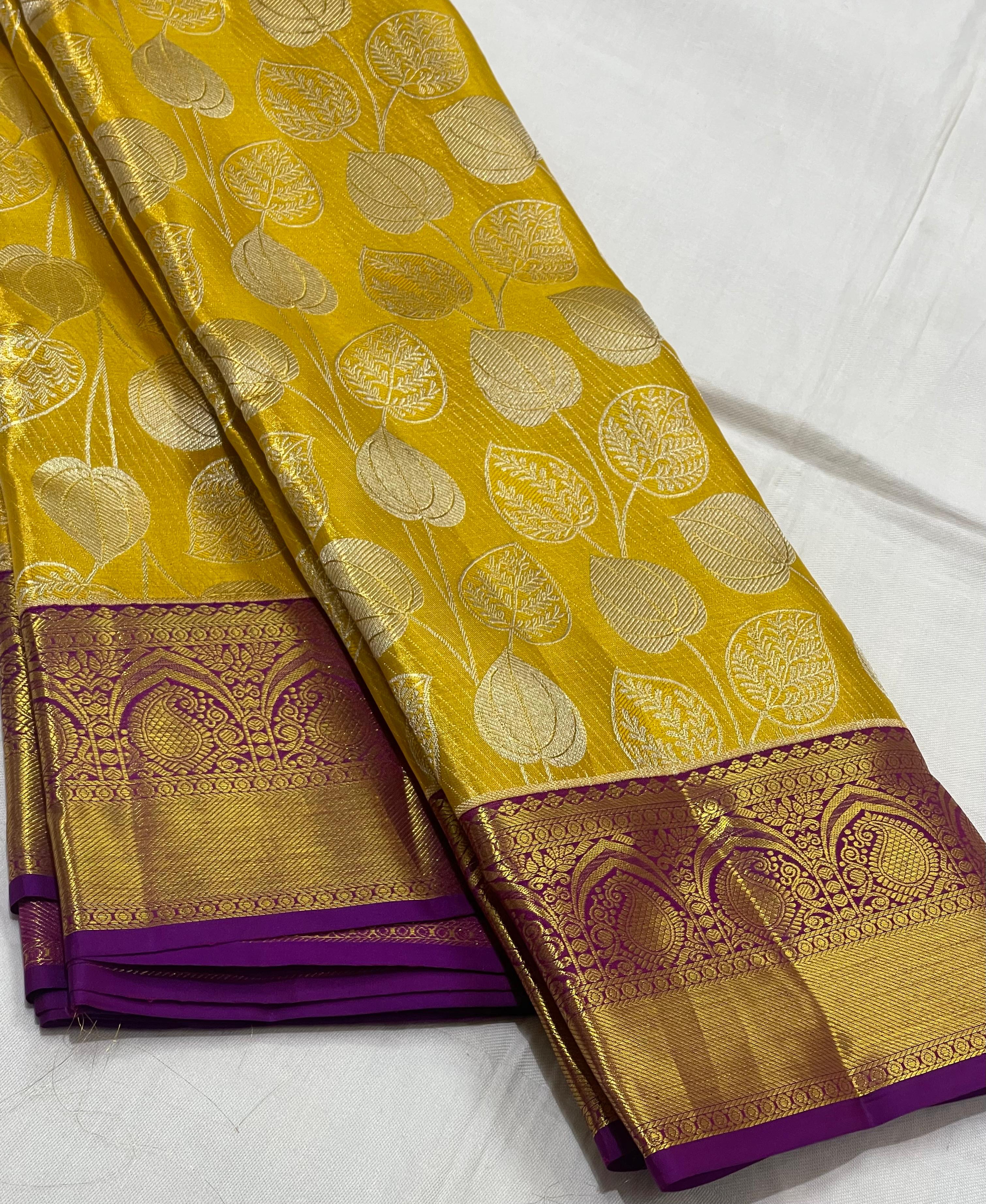 LEMON YELLOW/PURPLE BORDER COMBITION PURE KANCHI SILK SAREE