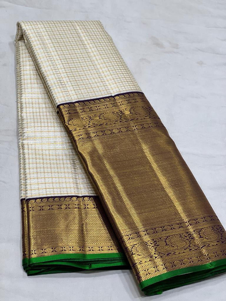 HALF WHITE/BROWN COLOUR ZARI BORDER COMBITION PURE KANCHI SILK SAREE
