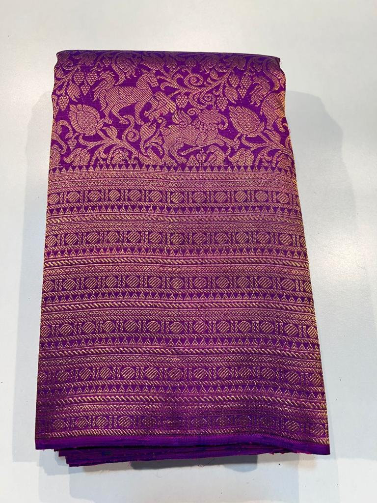 pure zari,Kanchipuram Handloom silk saree in gold zari,Buttis on body,Grand Pallu,Plain blouse.