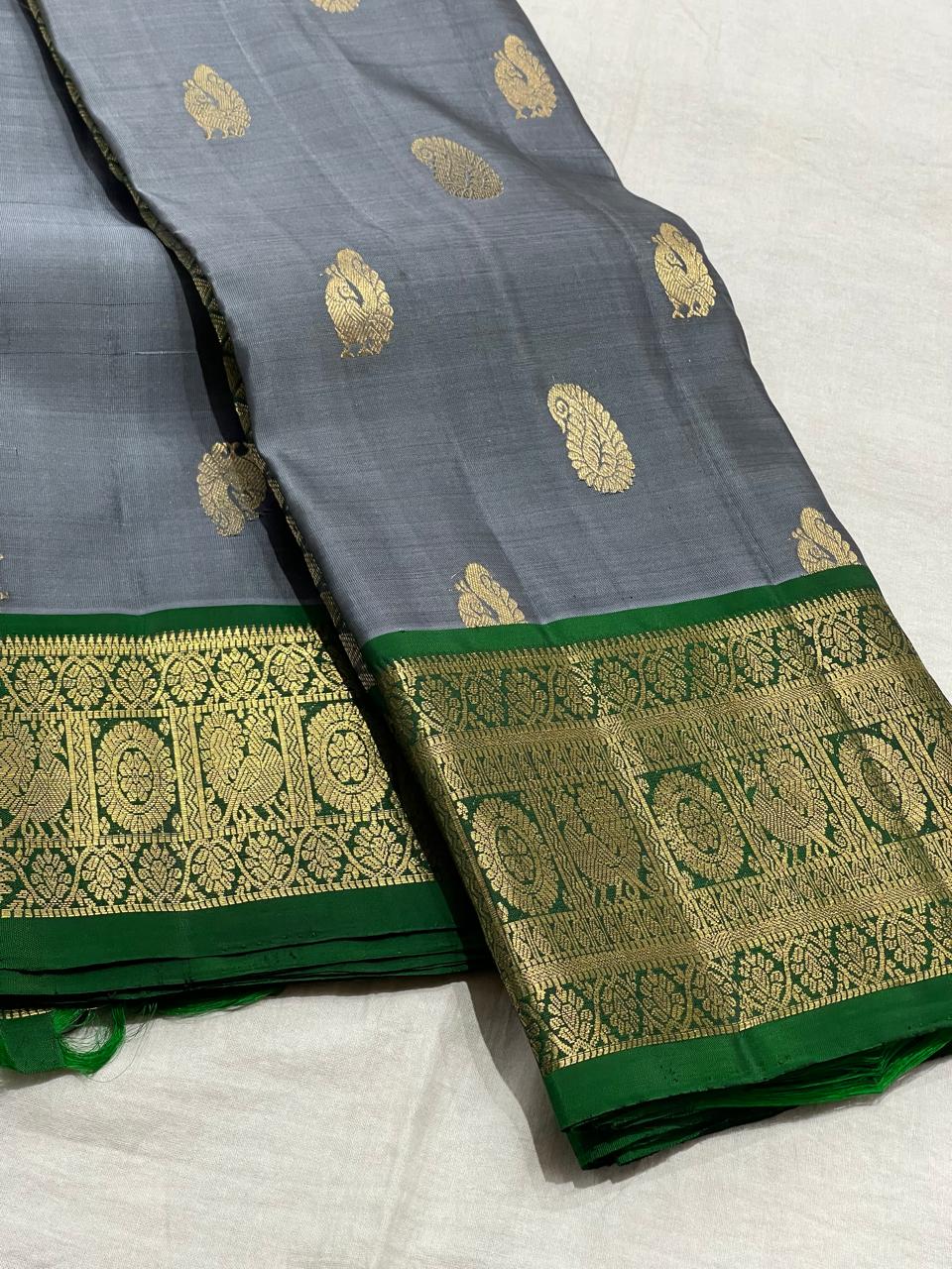 GREY/BOTTLE GREEN COLOUR COMBITION PURE KANCHI SILK SAREE