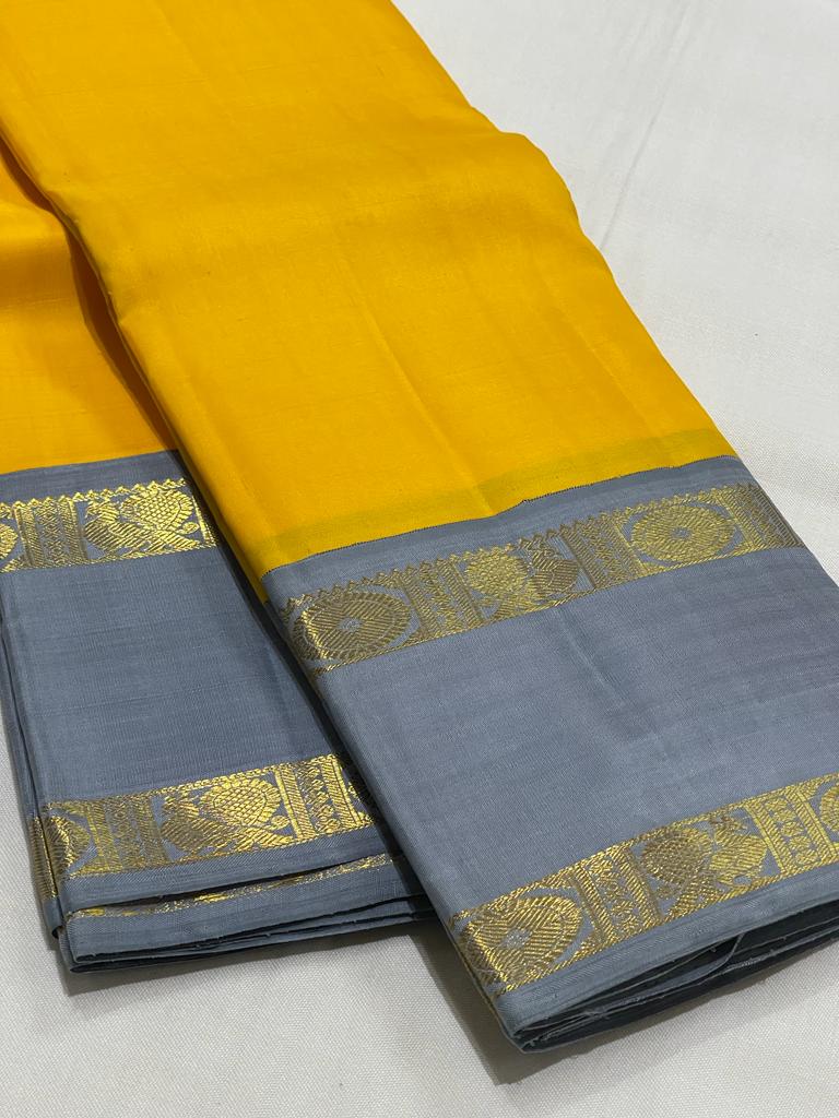 LEMON YELLOW/GREY COMBITION PURE KANCHI SILK SAREE