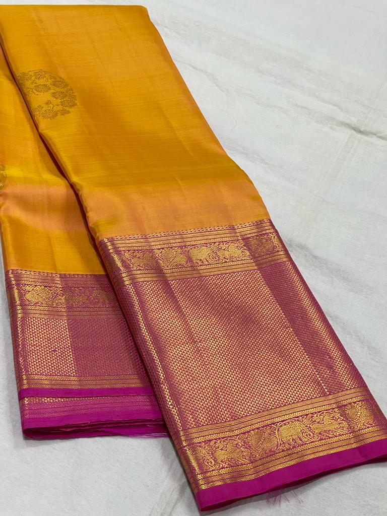 MUSTARD YELLOW/PINK COLOUR COMBITION PURE KANCHI SILK SAREE