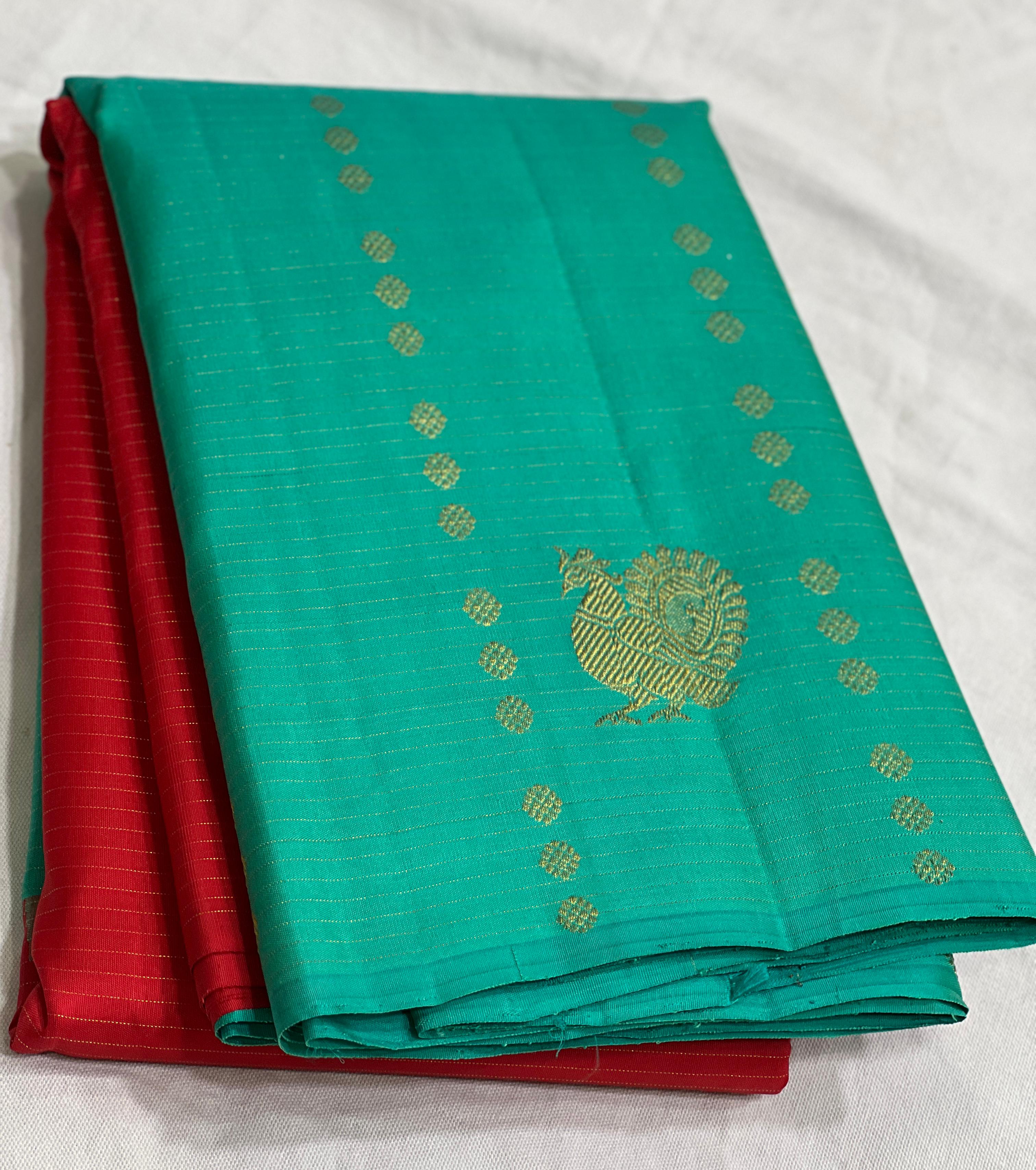 RED/TORQUISE BLUE COLOUR ZARI BORDER COMBITION PURE KANCHI SILK SAREE
