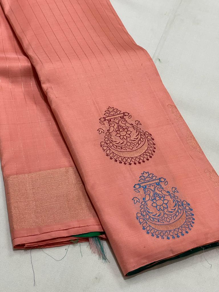 RAMA BLUE/LITE ORANGE COMBITION PURE KANCHI SILK SAREE
