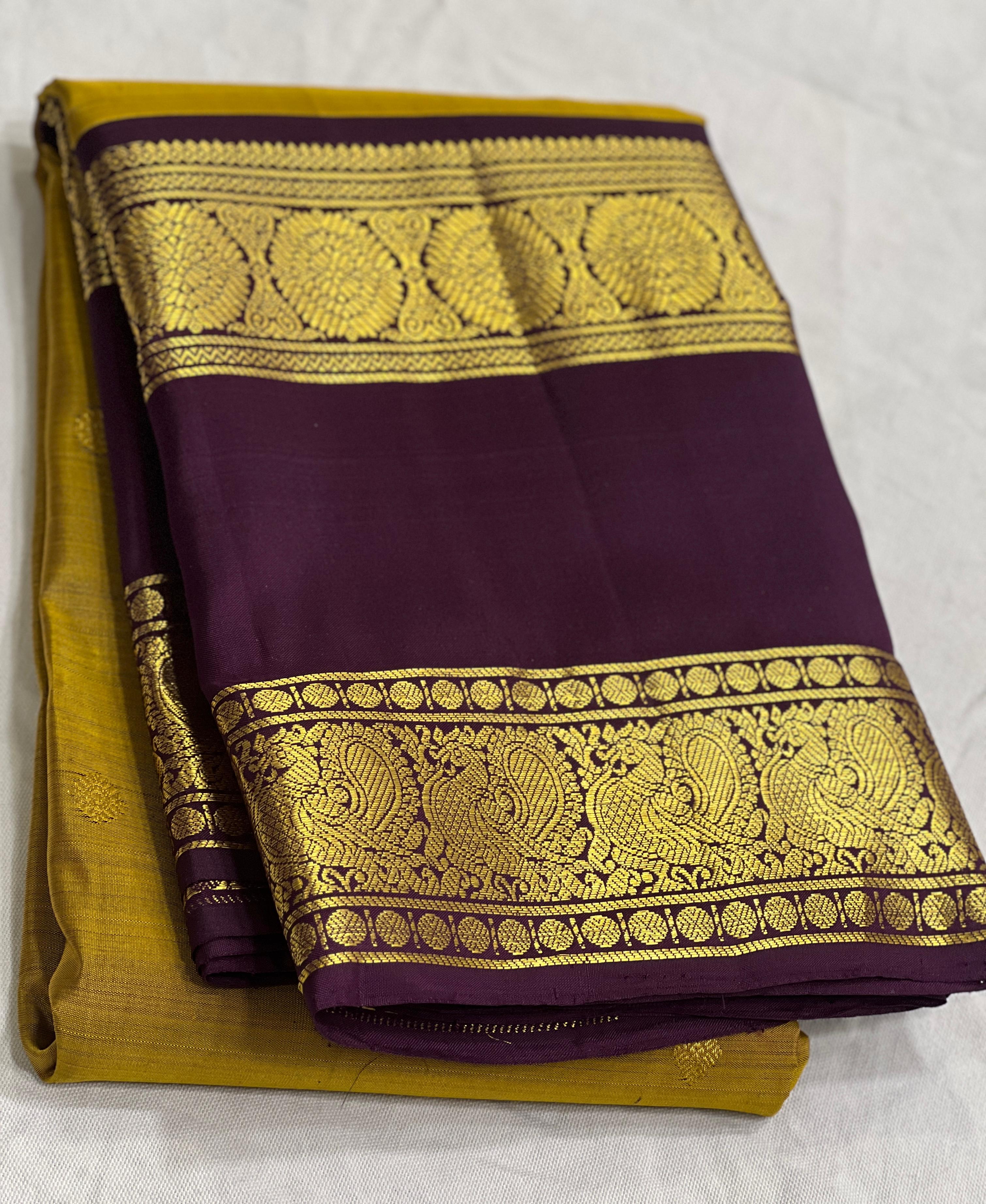 MUSTURD YELLOW/PURPLE  COLOUR  ZARI BORDER COMBITION PURE KANCHI SILK SAREE