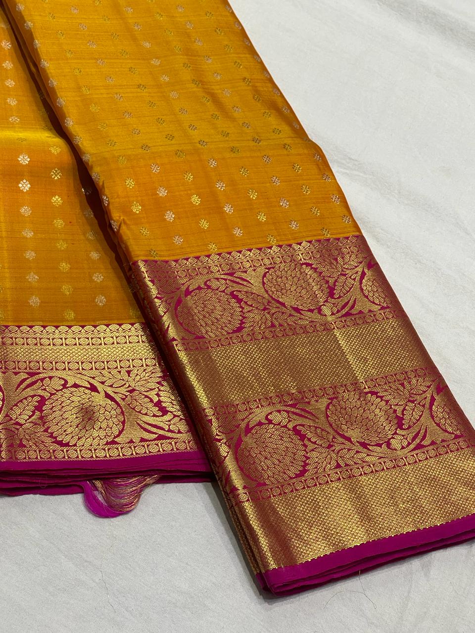MUSTARD YELLOW/PINK COMBITION PURE KANCHI SILK SAREE