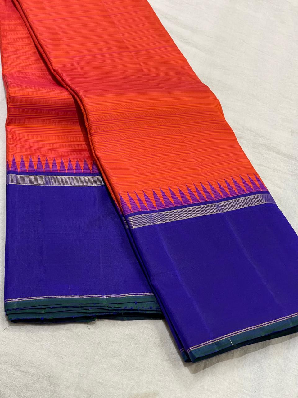 ORANGISH PINK/ROYAL BLUE BORDER COLOUR COMBITION PURE KANCHI SILK SAREE