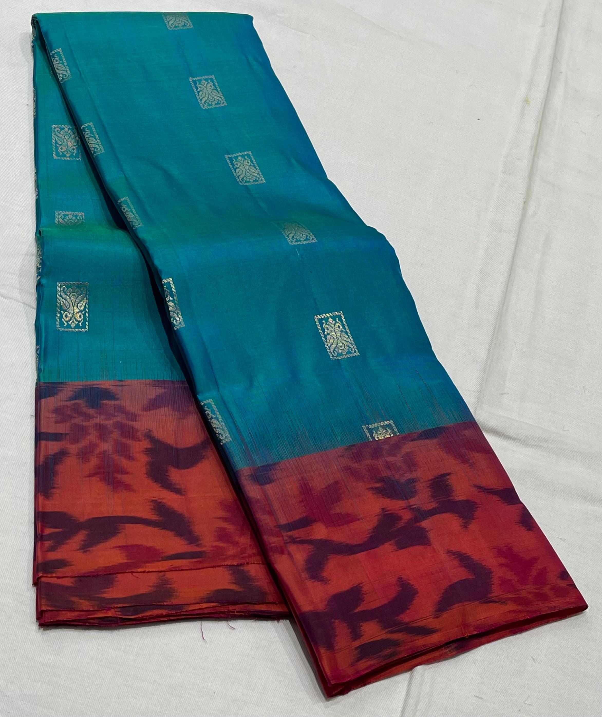 SKY BLUE/RED  COLOUR ZARI COMBINITION PURE SILK SAREES
