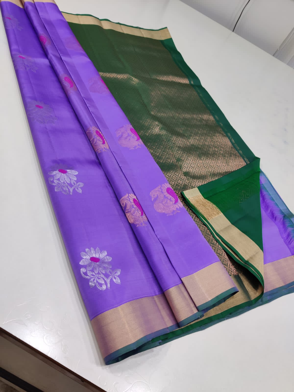 PURE KANCHIPURAM SOFT SILK HANDLOOM WITH UNIQUE COLLECTION BLOUSE WITH BORDER  Contrast Rich pallu with Tussels