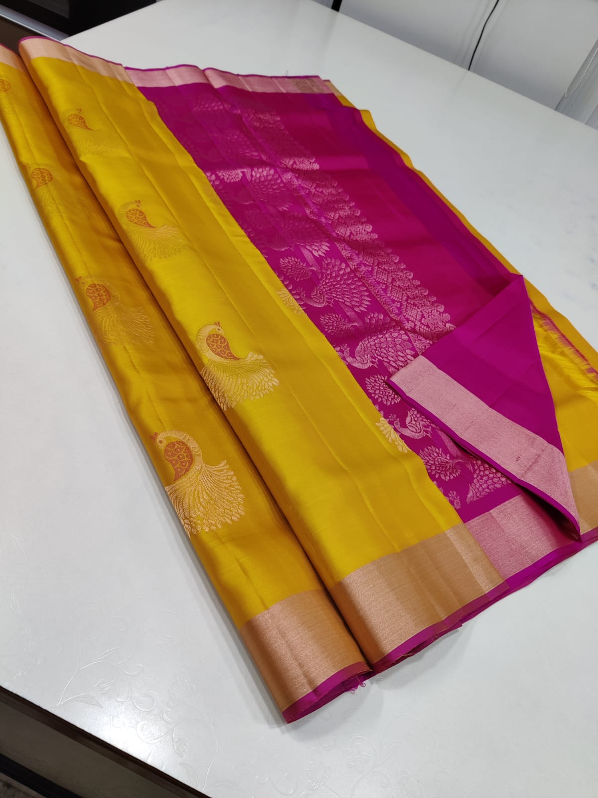 PURE KANCHIPURAM SOFT SILK HANDLOOM WITH UNIQUE COLLECTION BLOUSE WITH BORDER  Contrast Rich pallu with Tussels