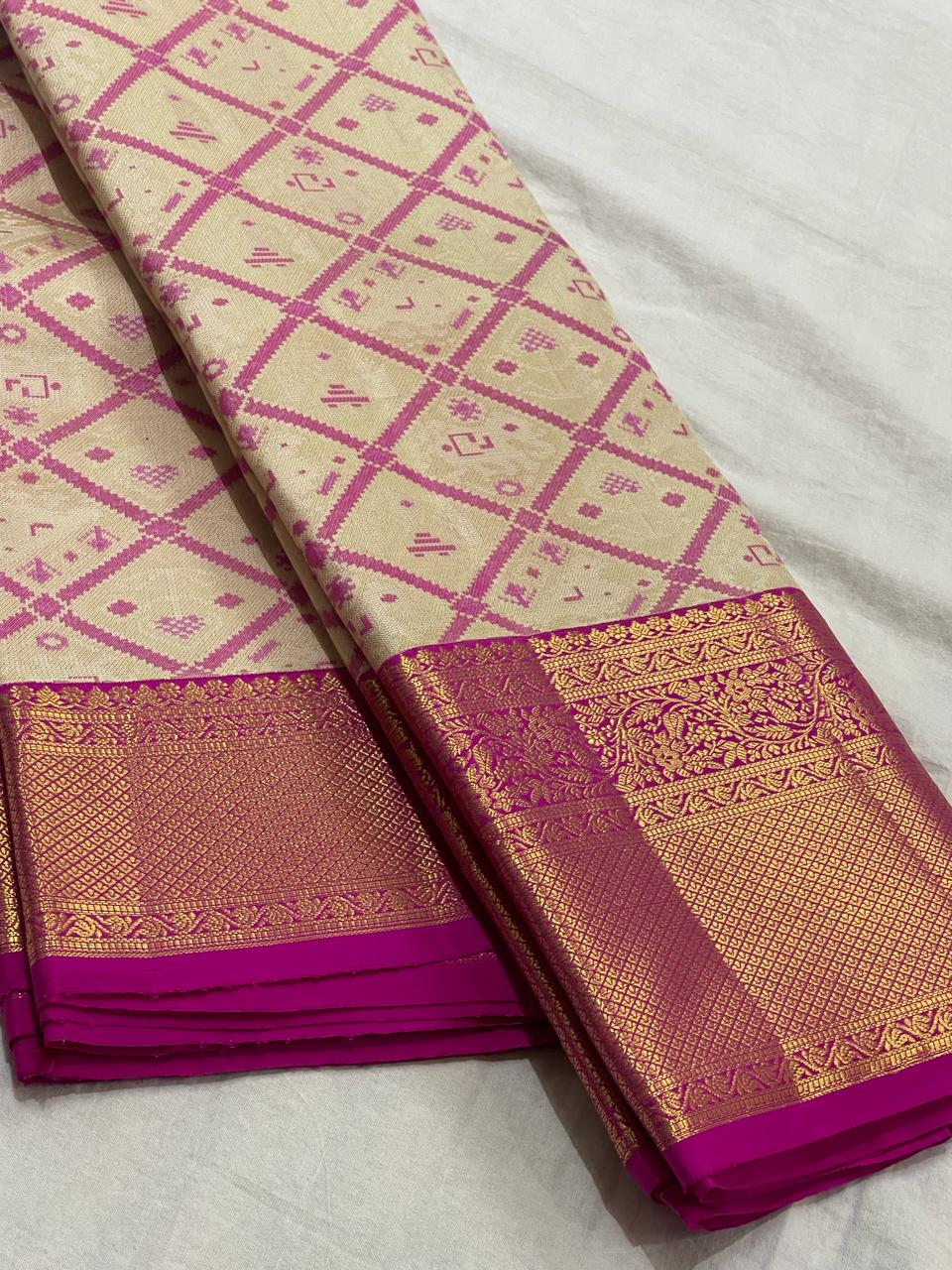 CREAM/PINK BORDER COMBITION PURE KANCHI SILK SAREE