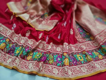 Elegant and timeless, this stunning red Banarasi silk saree features an intricate golden border embellished with a...