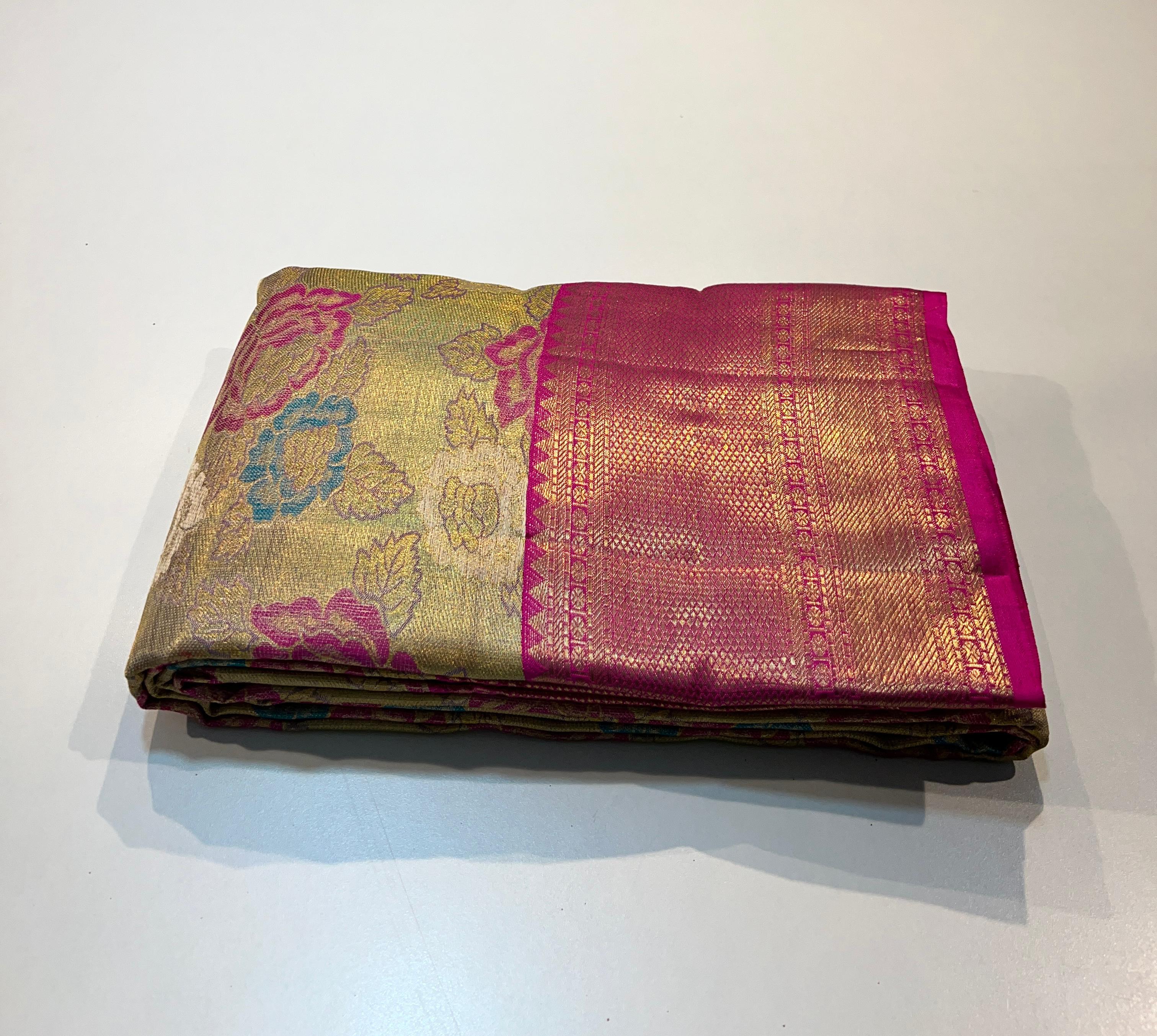 GOLD/SILVER/PINK COLOUR ZARI BORDER COMBITION PURE KANCHI SILK SAREE
