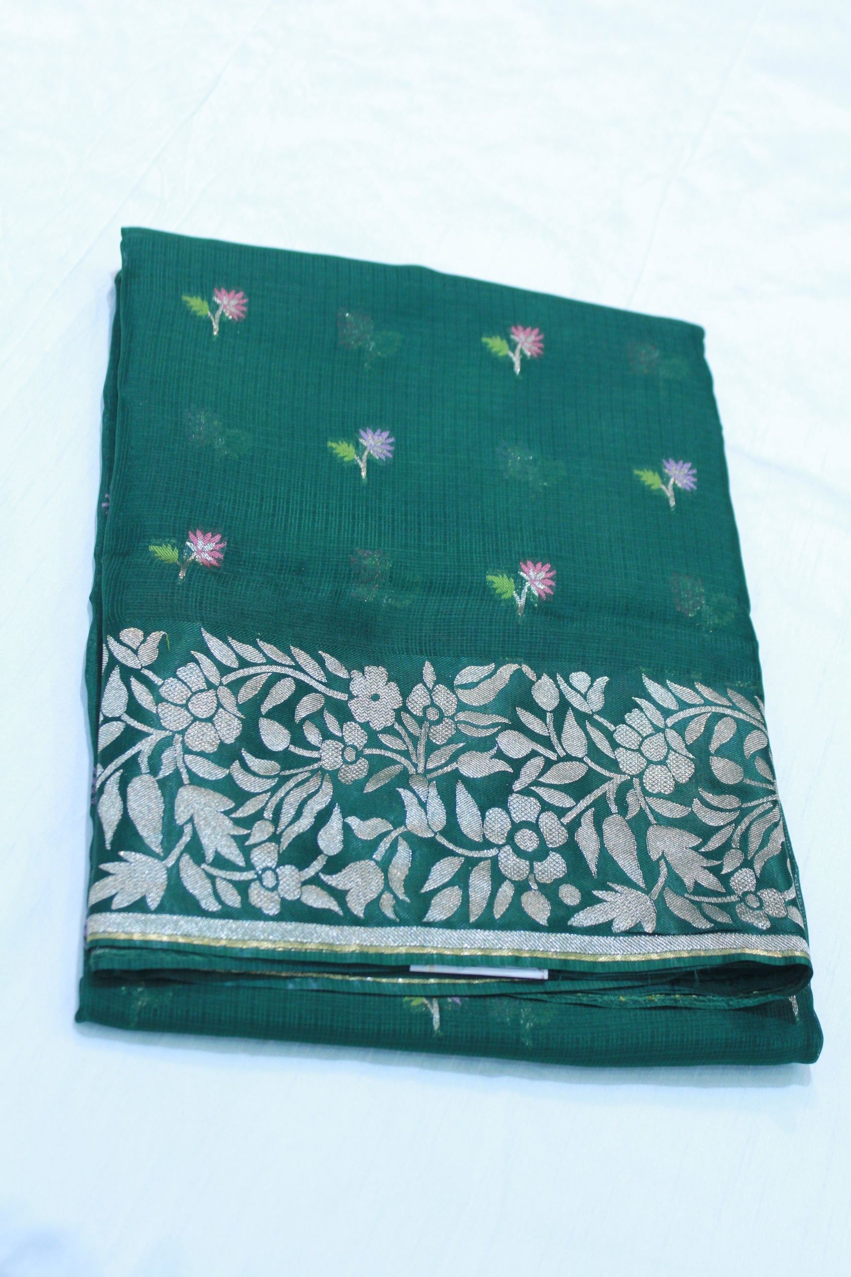 GREEN COLOUR / SILVER ZARI WITH FLORA DESIGN / FLORA BORDER